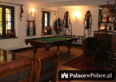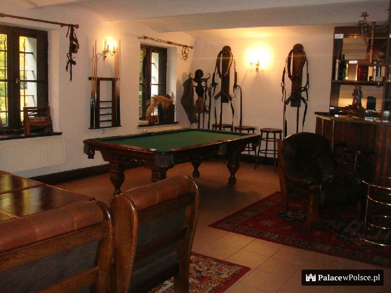 W części podpiwniczonej jest pokój bilardowy z barem , dwie jadalnie , łazienki , pokój , kuchnia z windą , kotłownia .